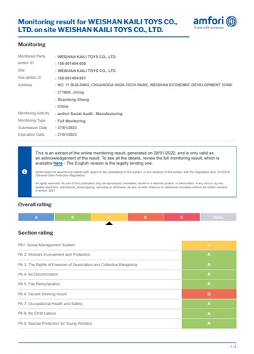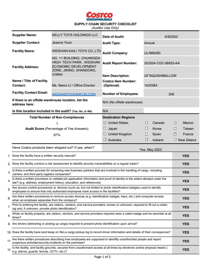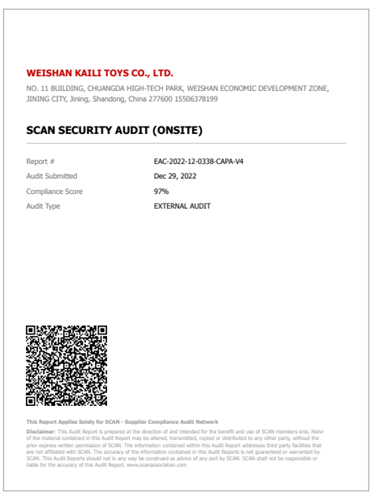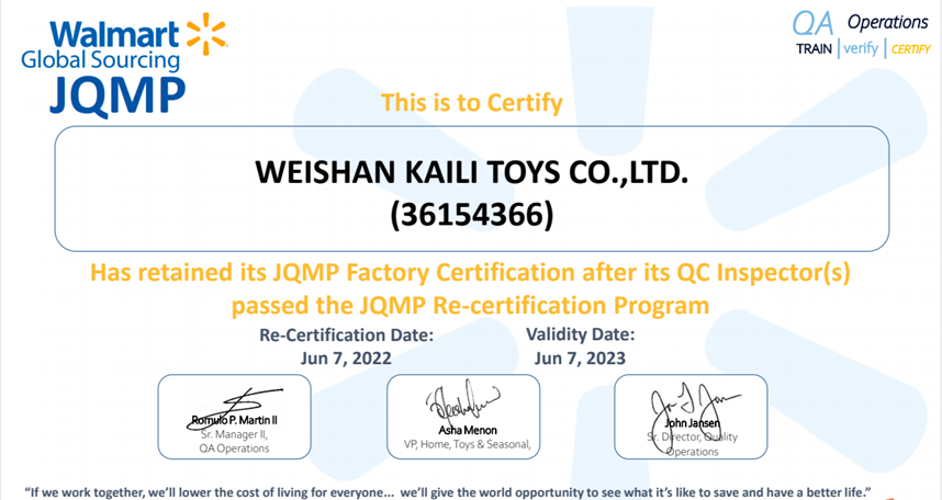 微山凯利玩具制造有限公司成立于2014年2月,位于美丽富饶的微山湖畔,主要经营毛绒玩具的加工、销售,货物的进出口贸易。公司占地面积16000平方米,先后通过了BSCI、GSV、沃尔玛、COSTCO、WALGREEN,ALDI的资格验厂,获得了ISO9001国际质量体系认证。公司投资了大量的现代化的生产设备,同时加大了人力资源投入,招聘了一批优秀的大学生,扩大设计和业务队伍,造就了一批训练有素,技艺熟练的工作人员和职工队伍。在产品的外观形象设计、品种多样化、质量安全等方面着力研发,更充分的满足于不同的客户要求。